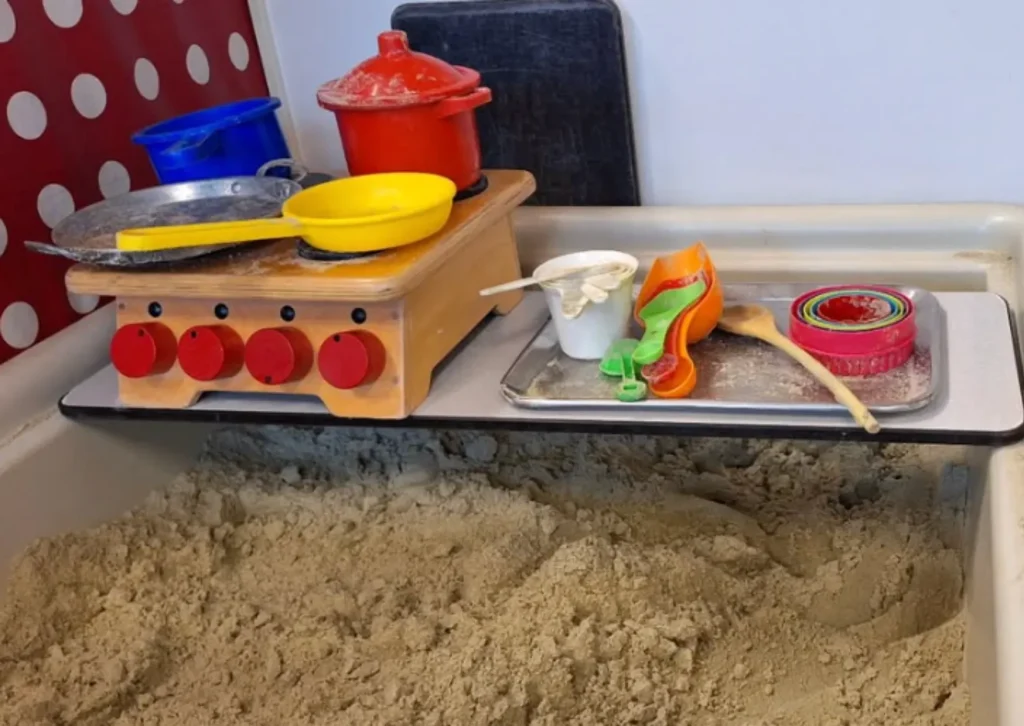 - Er is een zandtafel gevuld met rijst, papiersnippers, piepschuim of kinetisch zand.